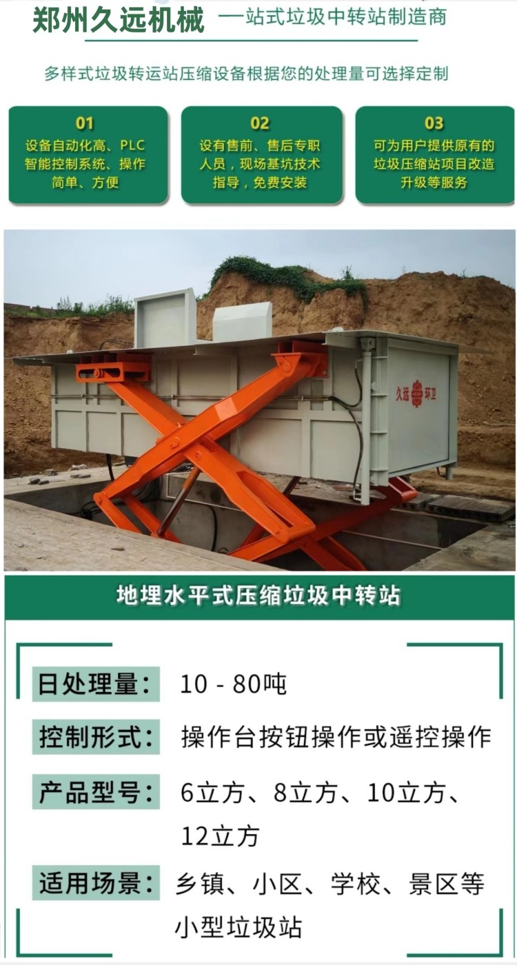 水平式生活垃圾壓縮中轉(zhuǎn)設(shè)備是將垃圾的卸(出)料、壓縮、儲存集合在一起,整體落于地下,利用地下空間將垃圾密閉在箱體內(nèi),地面上無垃圾外露現(xiàn)象,壓縮垃圾產(chǎn)生的污水經(jīng)排污管道直接流入污水井內(nèi),然后由污水泵排到城市污水管網(wǎng),徹底解決了垃圾在收集、儲存、裝運(yùn)過程中的污染環(huán)境、作業(yè)效率低等問題。